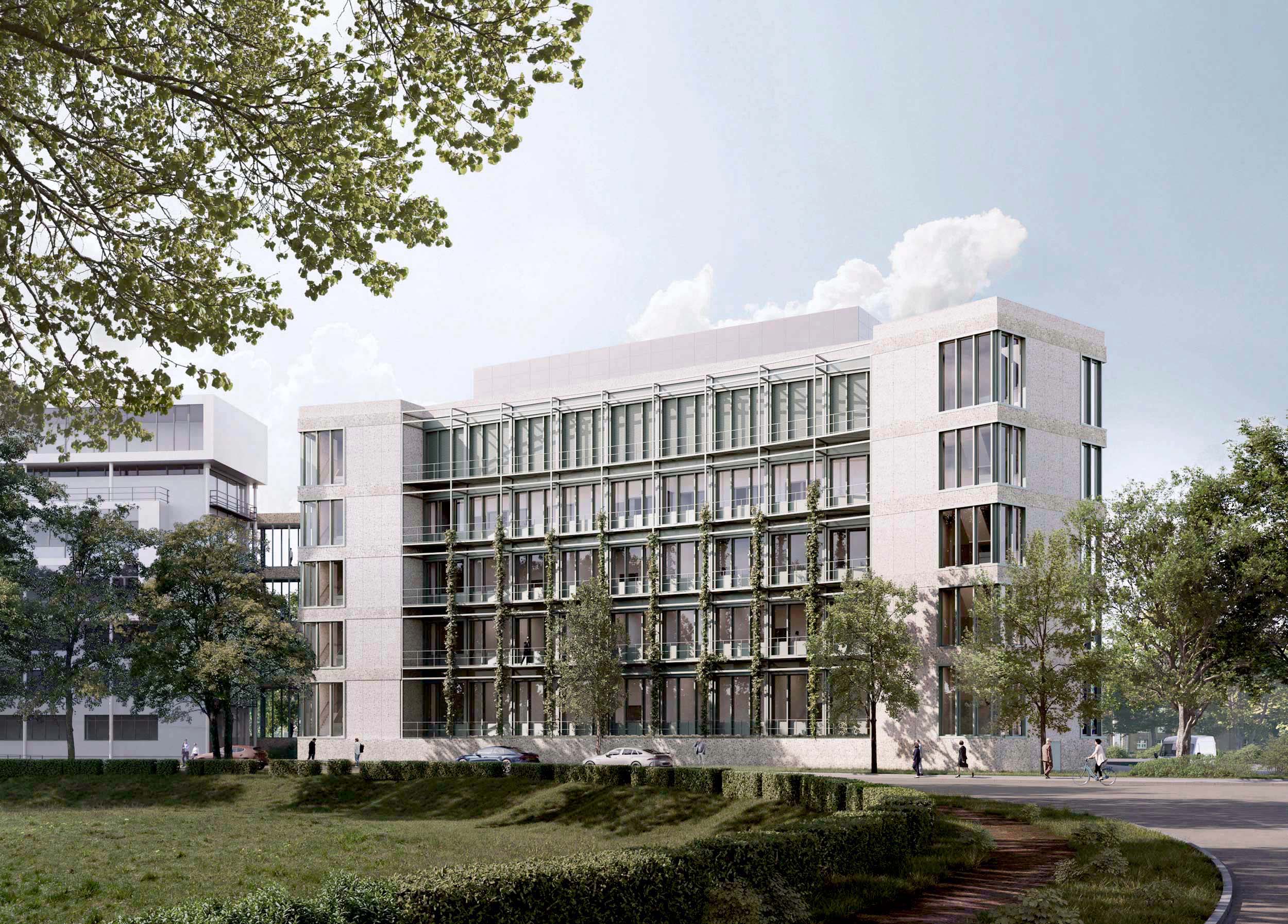 Die architektonische Gestaltung und Fassadenstruktur ergeben sich konsequent aus dem inneren Aufbau des Gebäudes. Ein klar ausgebildeter Sockel verankert den Baukörper im Stadtraum. Darüber vermittelt ein vorgelagerter Servicegang zwischen der gekurvten Platzkante und der orthogonalen Organisation der Laborbereiche. Filigrane Metallkonstruktionen und begrünbare Fassadenelemente gliedern die Fassadenflächen und verleihen dem Baukörper eine feingliedrige, dem Stadtraum angemessene Maßstäblichkeit.