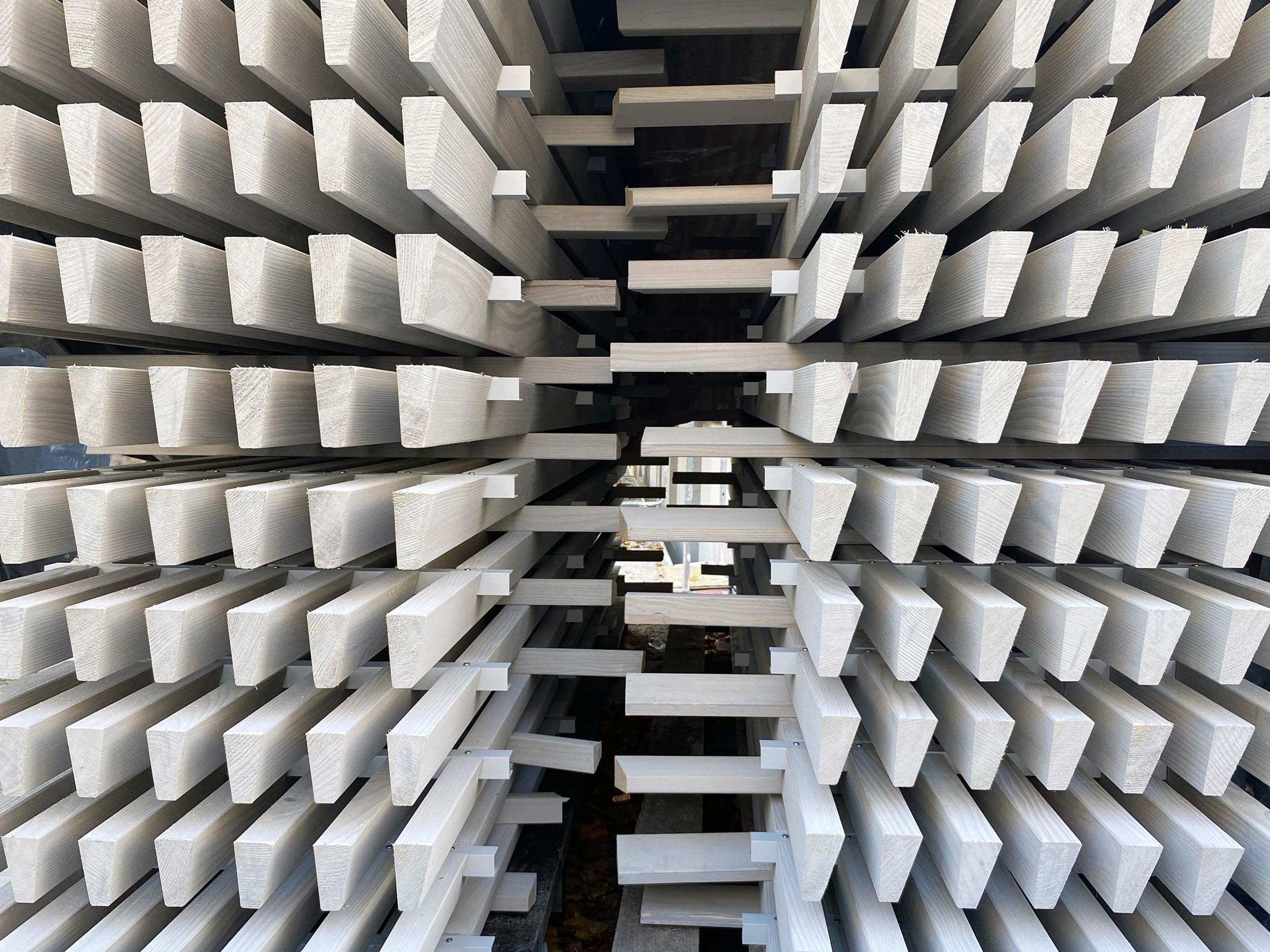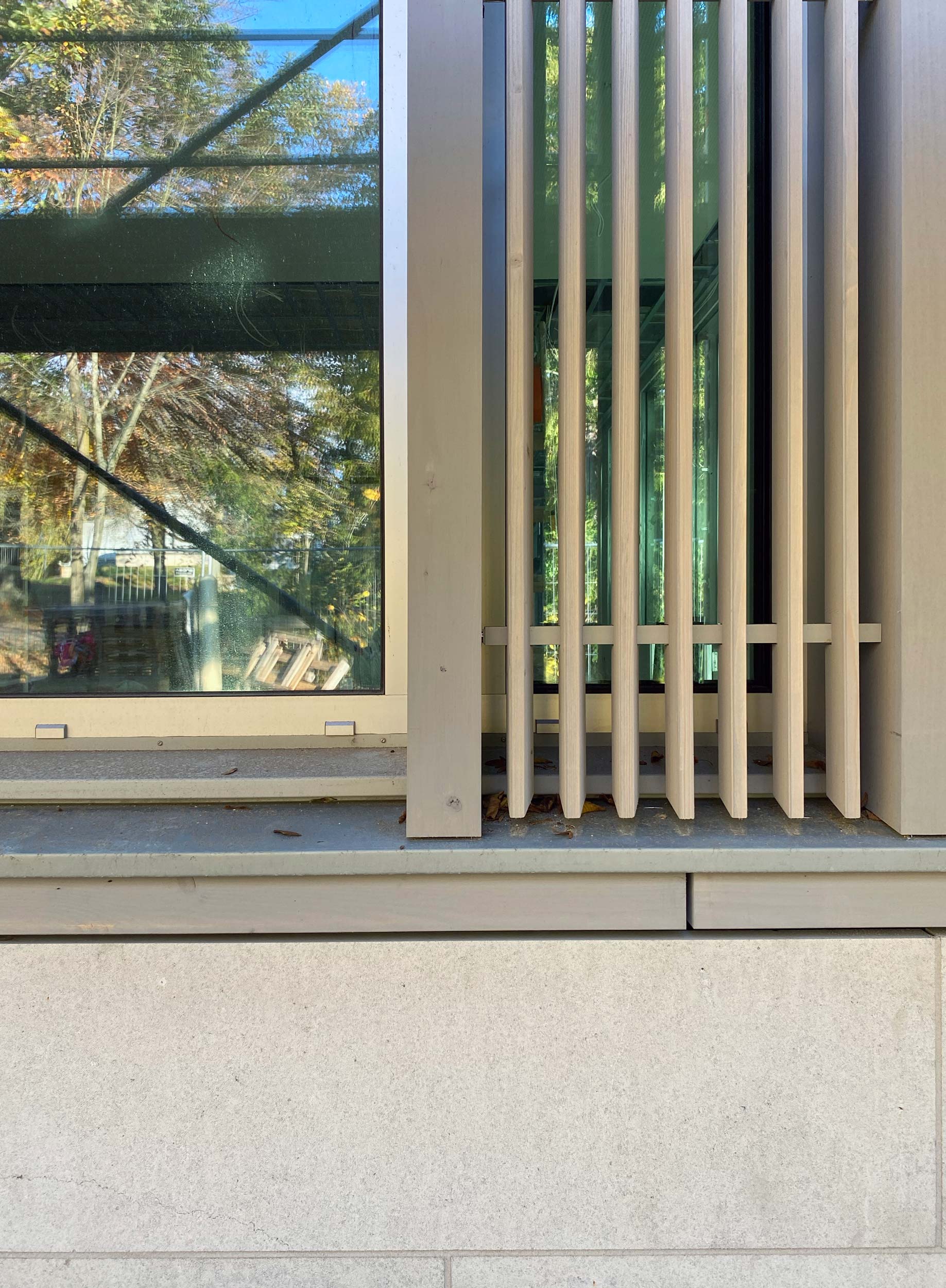 Der in den Park eingebettete Institutsneubau erhält eine aus vertikalen und horizontalen Elementen bestehende Holzfassade, die sich mit ihrer filigranen Struktur mit dem Baumbestand überlagert und sich auf dem Grundstück so bestmöglich einfügt.